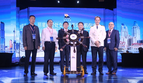 (左起)天津市人民政府口岸服务办公室副处长曹世荣先生、天津边防总站 副总站长宋继双先生、云顶邮轮集团业务规划及港口管理部高级副总裁林俊彦先生、天津港(集团)有限公司董事长张锐钢先生、处女星号船长Captain Vaclav Joakim Vonasek、云顶邮轮集团北方区域销售总监张勇先生为「处女星号」开启天津首航第一舵。