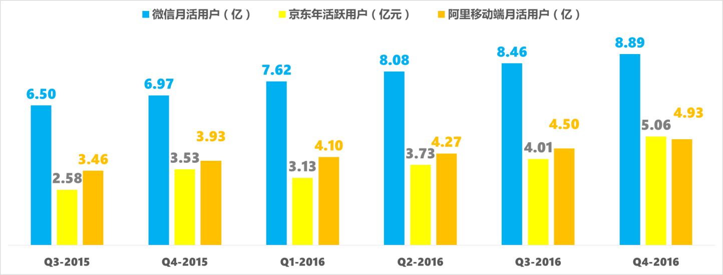 比较一下微信、阿里、京东三家的流量。用通俗的语言来理解,64%的国人每月至少用一次微信,35%的人每月至少逛一次淘宝天猫,35%的人每年至少在京东下一次单。一个是社交,一个是逛街,一个是购物,互联网中的看、逛、买”差不多就是这样一个局面。