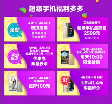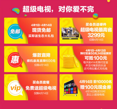 414当天,购买乐视会员即可获赠免费硬件,超级电视最高省3299元,超级手机最高省2599元,并有预约好礼、天降红包雨、神价秒杀等不同程度的优惠和服务政策,让用户用最优惠的价格把极致、惊艳的硬件新品福利带回家。